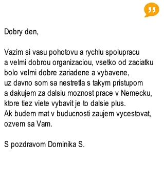 Na našej FB stránke nájdete ďalšie referencie a hodnotenia uchádzačov. Vycestovali ste za prácou cez nás? Ohodnoťte aj vy naše služby na facebooku . Sme vďační za každú referenciu!
