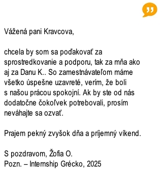 Na našej FB stránke nájdete ďalšie referencie a hodnotenia uchádzačov. Vycestovali ste za prácou cez nás? Ohodnoťte aj vy naše služby na facebooku . Sme vďační za každú referenciu!